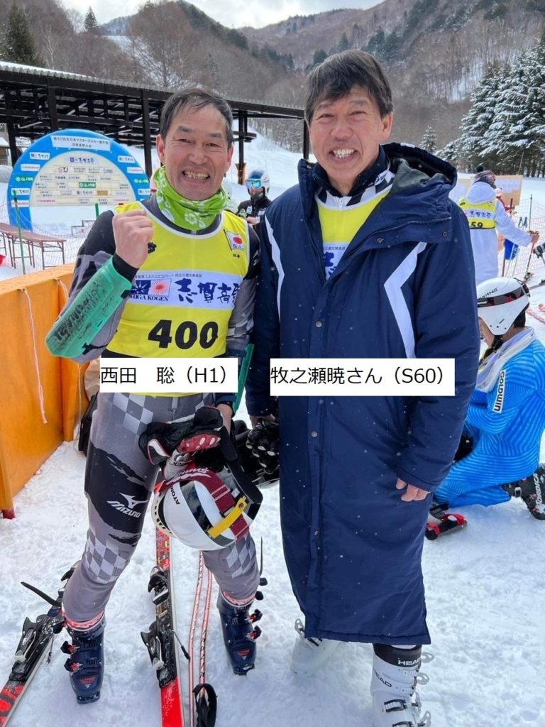 フィニッシュエリアで先に滑り終えた牧之瀬さんが待っていて、「西田、足ヨレてるぞ!!」と声がかかりました。35年前の現役時代と同じ、、珍事となりました。